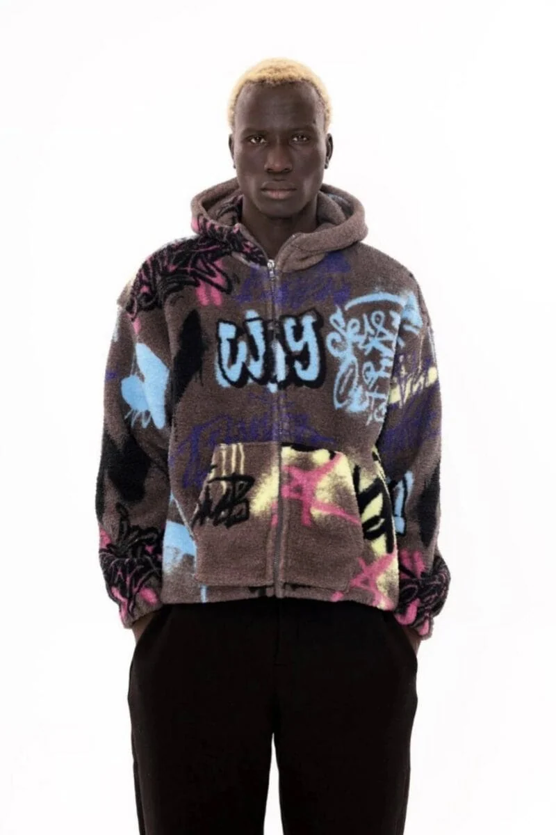 Bring street culture to the forefront of your style with this eye-catching Smokie Grey Graffiti Print Zip-Up Teddy Hoodie. It’s time to let your bold side shine.